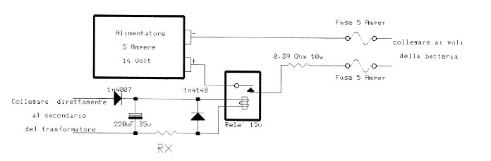 Potete omettere tutta questa parte del circuito (relè, diodi 1n4148 e1n4007, condensatore da 220 uF e resistenza Rx) se il vostro alimentatore riesce ad arrivare a 14,7 Volt. Infatti, in sostituzione di questa parte del circuito potete inserire un diodo da 6-7 Ampere (che come sapete introduce una caduta di tensione di 0,7 Volt). Accertatevi che il vostro alimentatore regolato a tale tensione riesca effettivamente ad erogare 5 ampere. In caso contrario, l’alimentatore potrebbe non ricaricare correttamente la batteria.